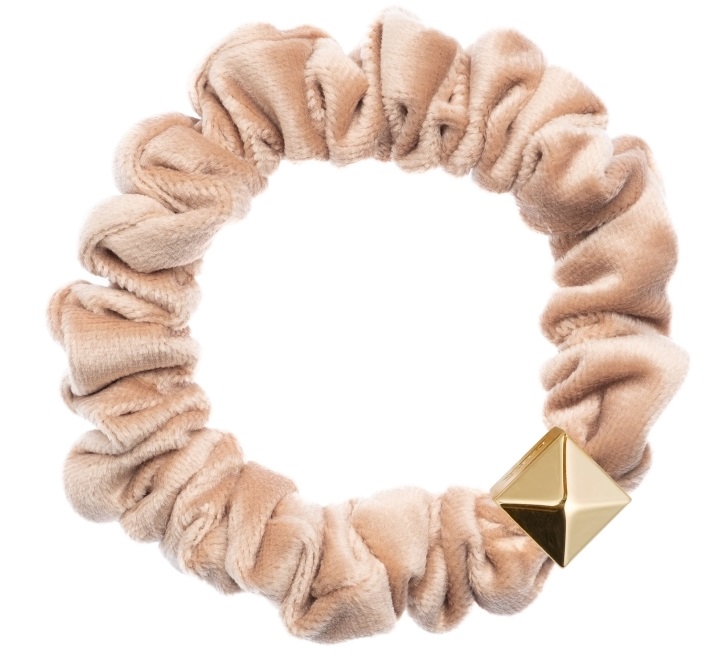 Ohut samettipäällysteinen hiusdonitsi. Kultasella pohjalla Dark-logo.