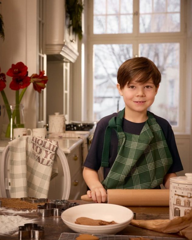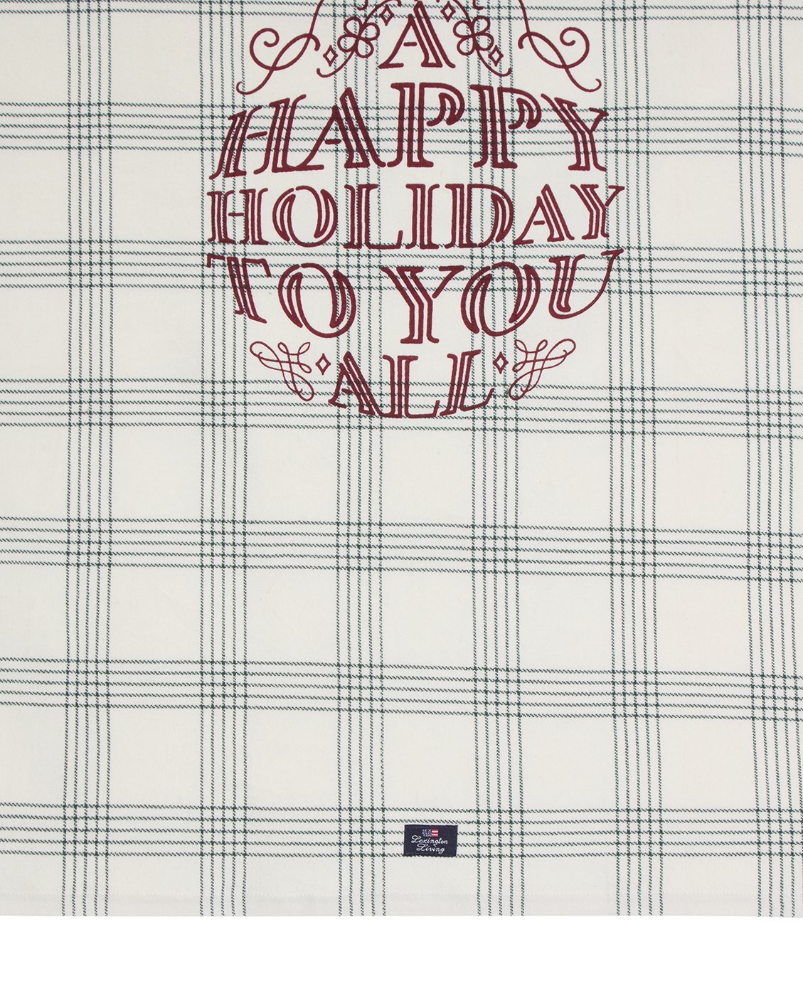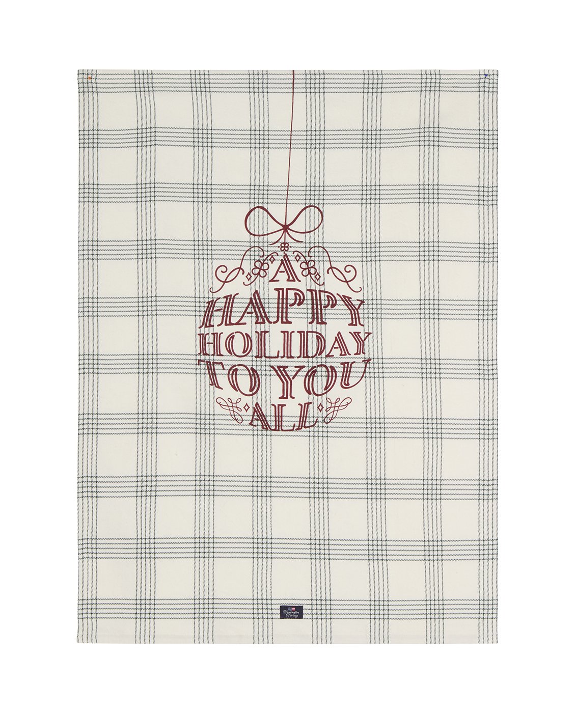 Ruudullinen keittiöpyyhe "A HAPPY HOLIDAY TO ALL"-tekstillä.