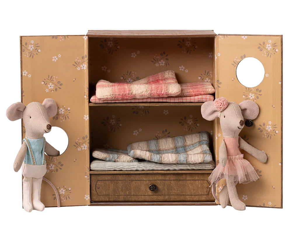 Setti sisältää poika- ja tyttöhiiren sekä kummallekin oman patjan, peiton ja tyynyn.