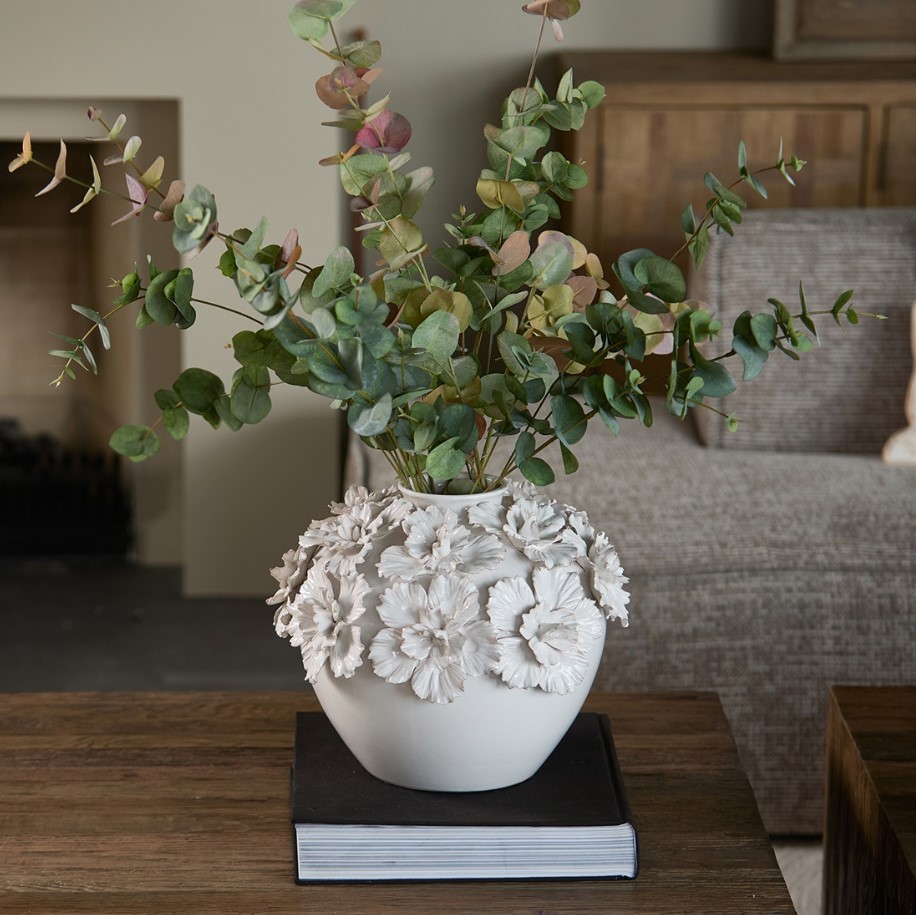 Vaasin yläreunaa koristaa käsin valmistetut keraamiset kukat.