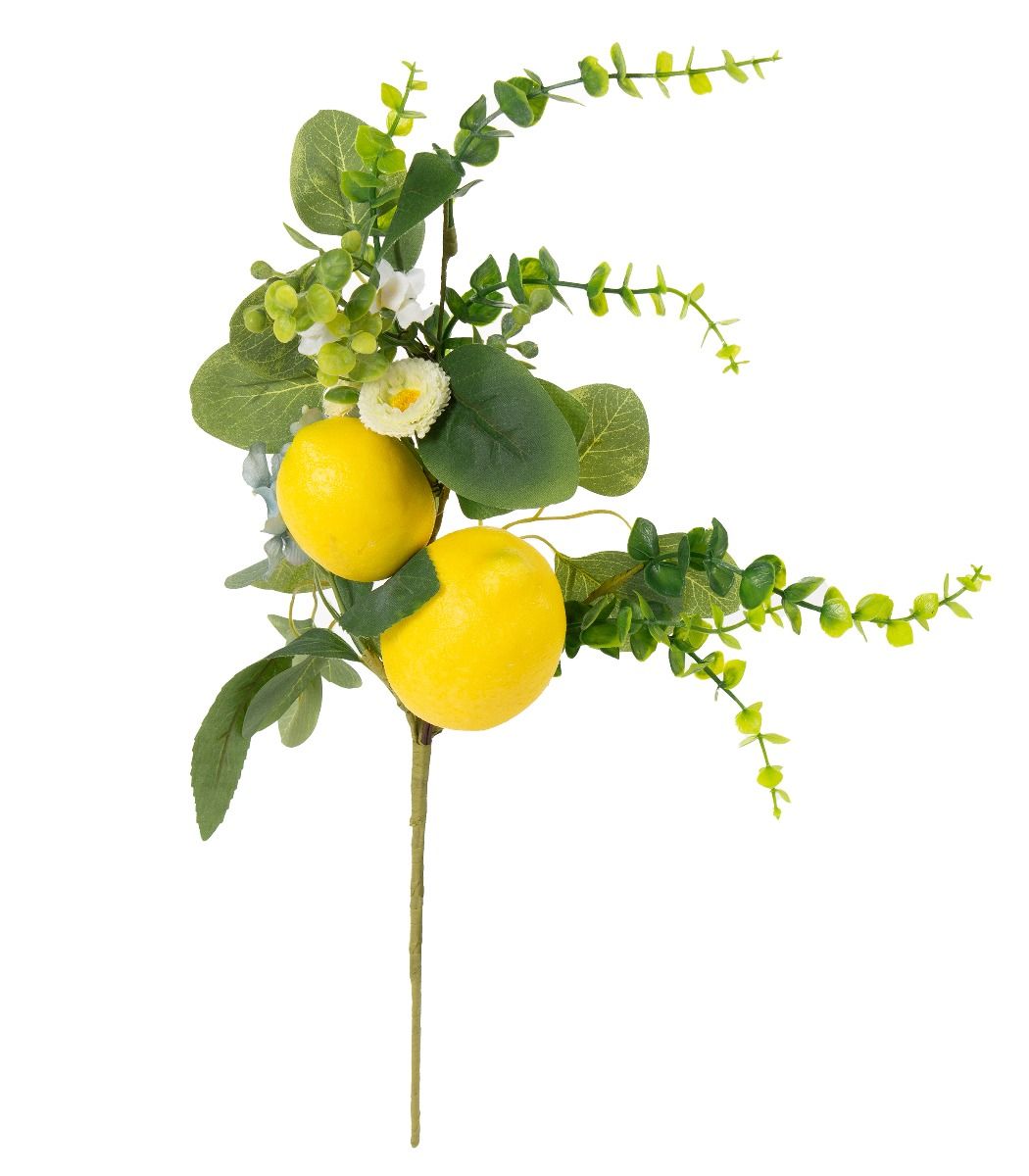 Oksassa kaksi sitruunaa, lehtiä ja kukkia.