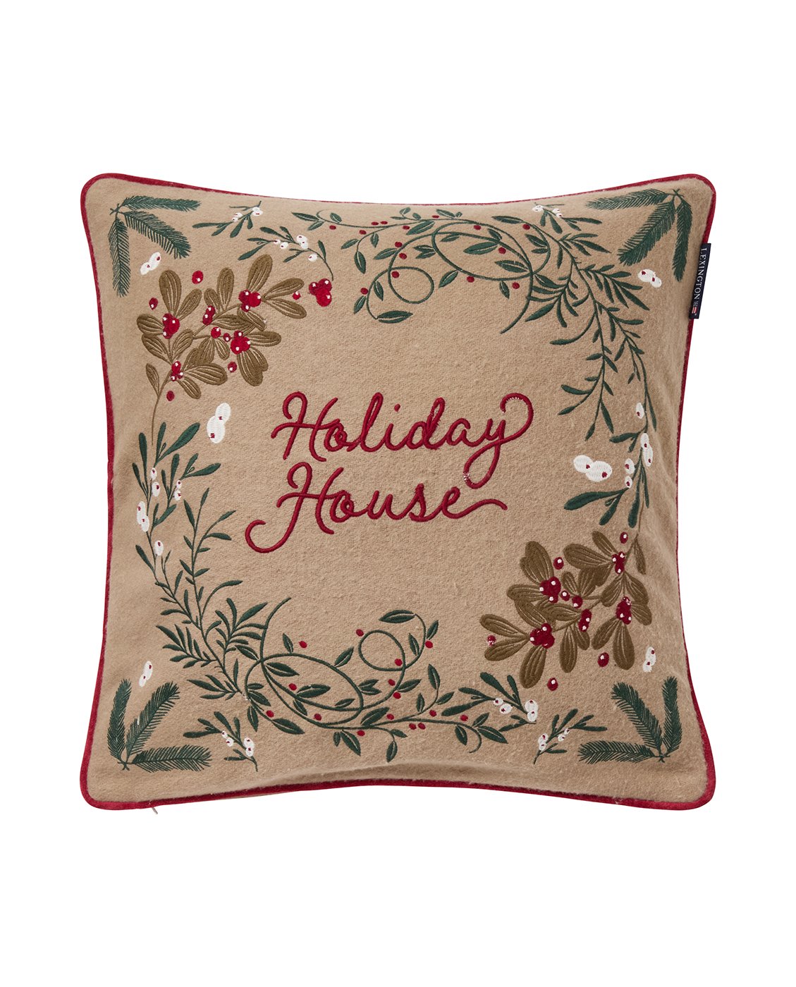 Tyynyyn kirjailtuna kuviot ja "HOLIDAY HOUSE"-teksti.
