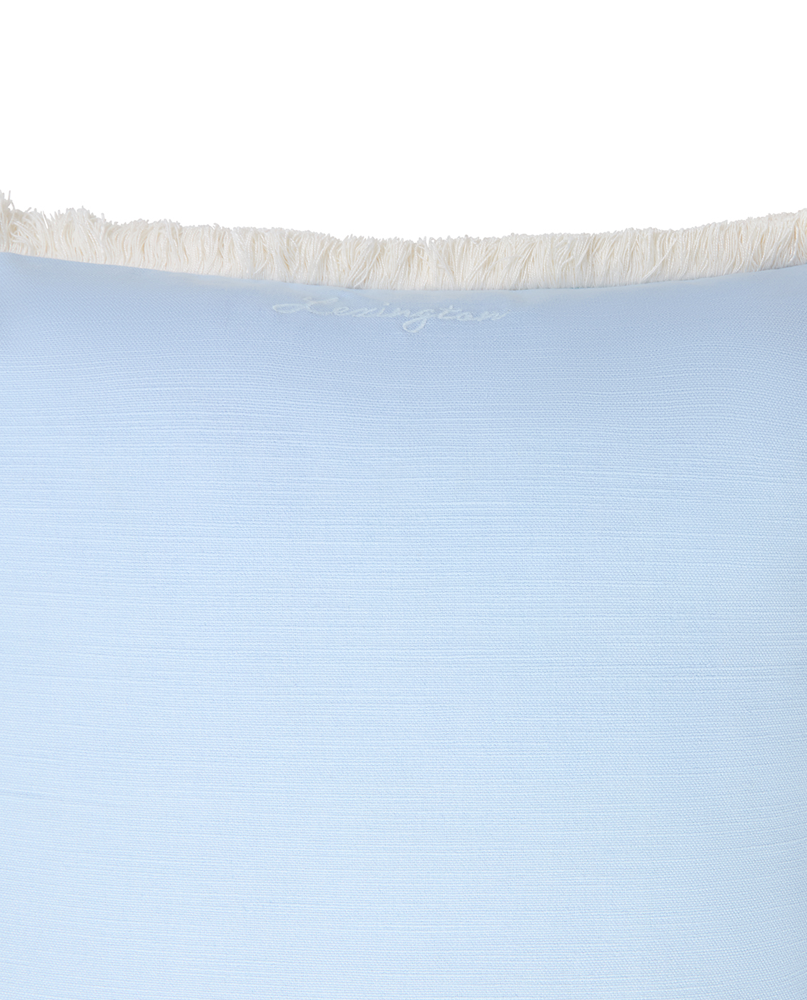 Pehmeä ja rento valkoisilla puuvillahapsuilla koristeltu tyynynpäällinen.