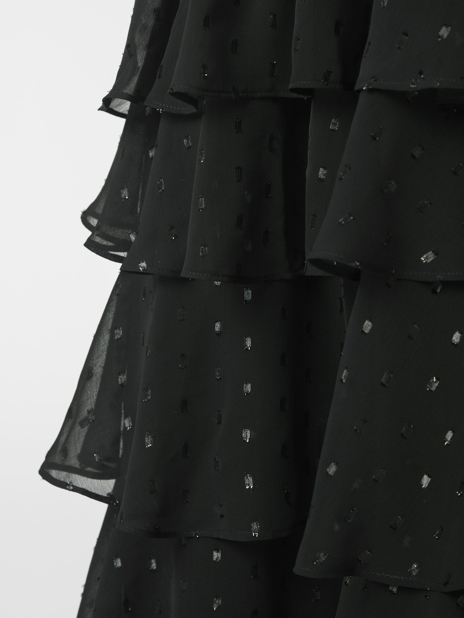 Kerrostettua röyhelöintiä mekon alaosassa.