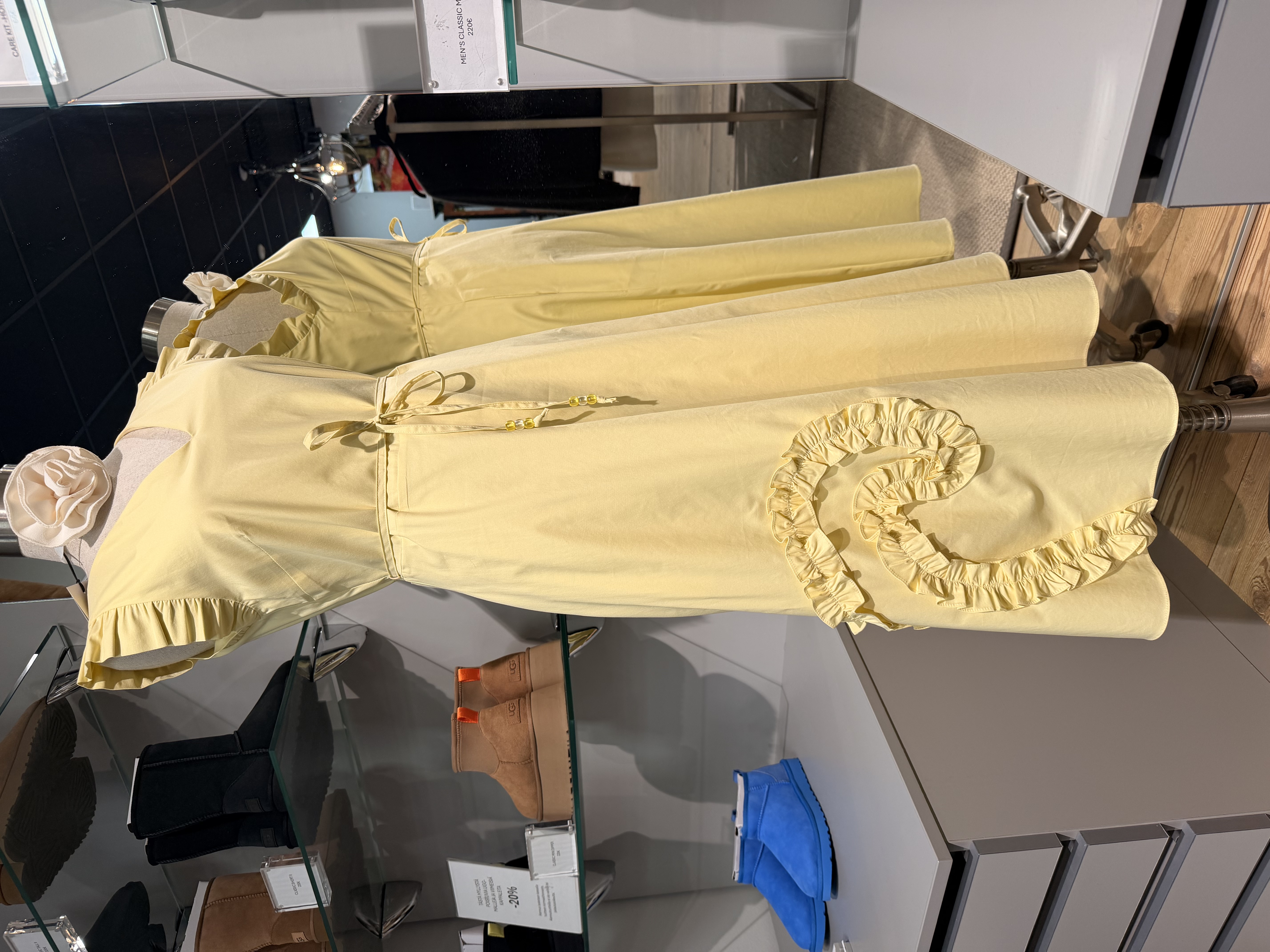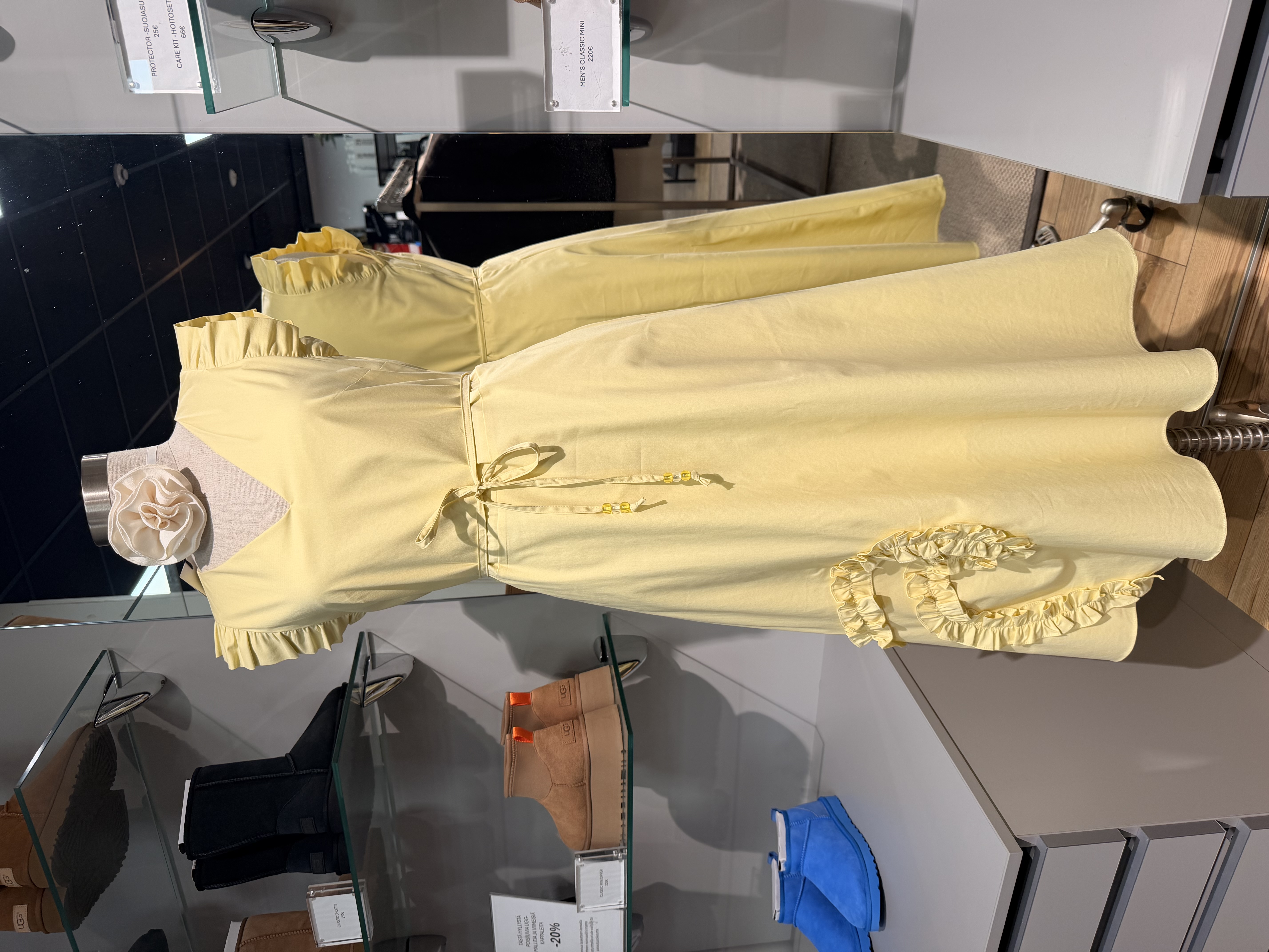 Pitkä puuvillamekko rypytetyillä yksityskohdilla ja lyhyillä hihoillaeleri.