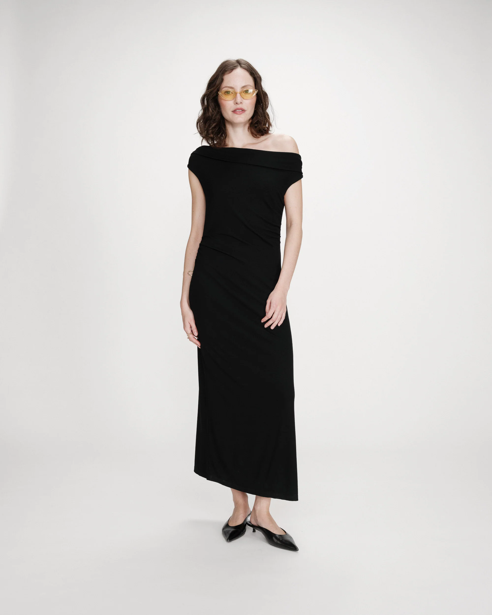 Musta kapeamallinen mekko.