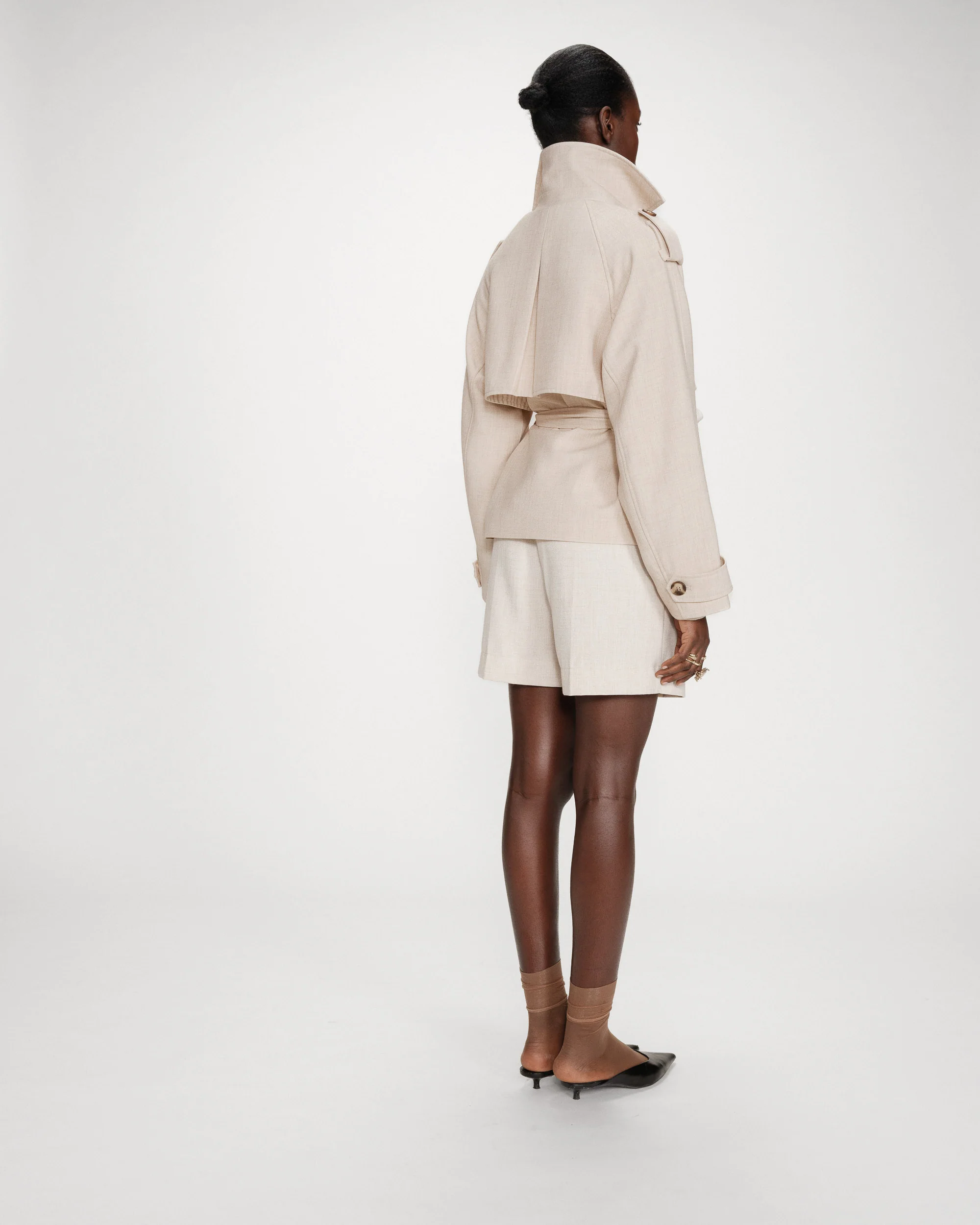 65% polyesteriä, 30% viskoosia, 5% elastaania. Vuori puuvillaa. Kuivapesu.