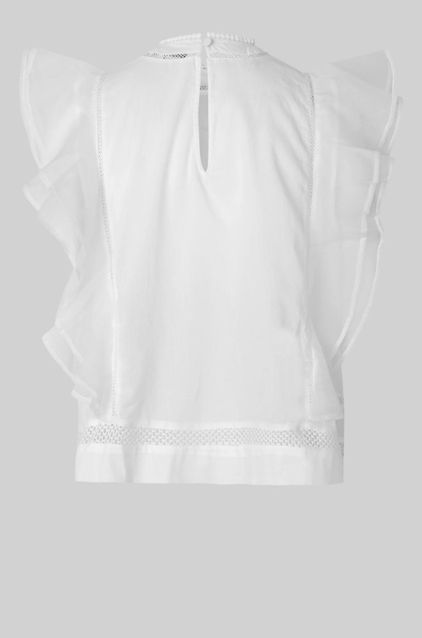 Pusero 100% puuvillaa ja röyhelöt 100% nylonia. Pesu 30-asteessa.