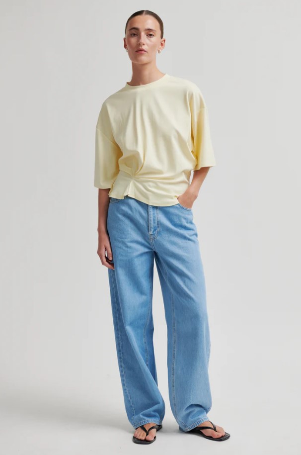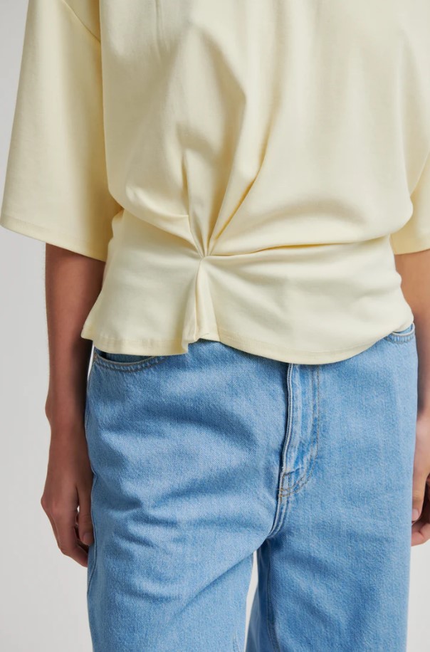 47% lyocelliä., 41% puuvillaa ja 12% elastaania. Pesu 30-asteessa.