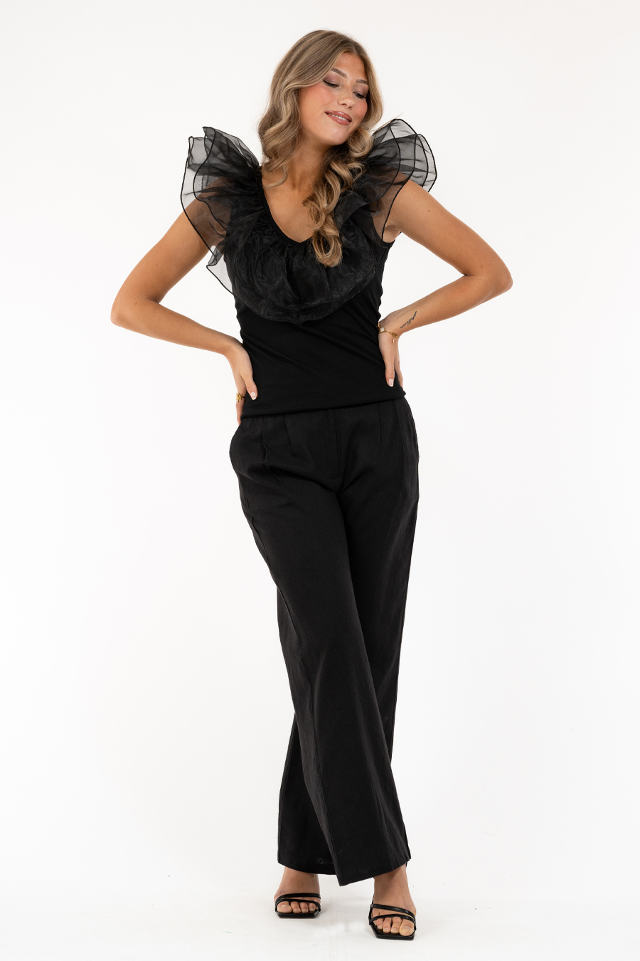 Hihoissa ja pääntiessä näyttävät organza-röyhelöt.