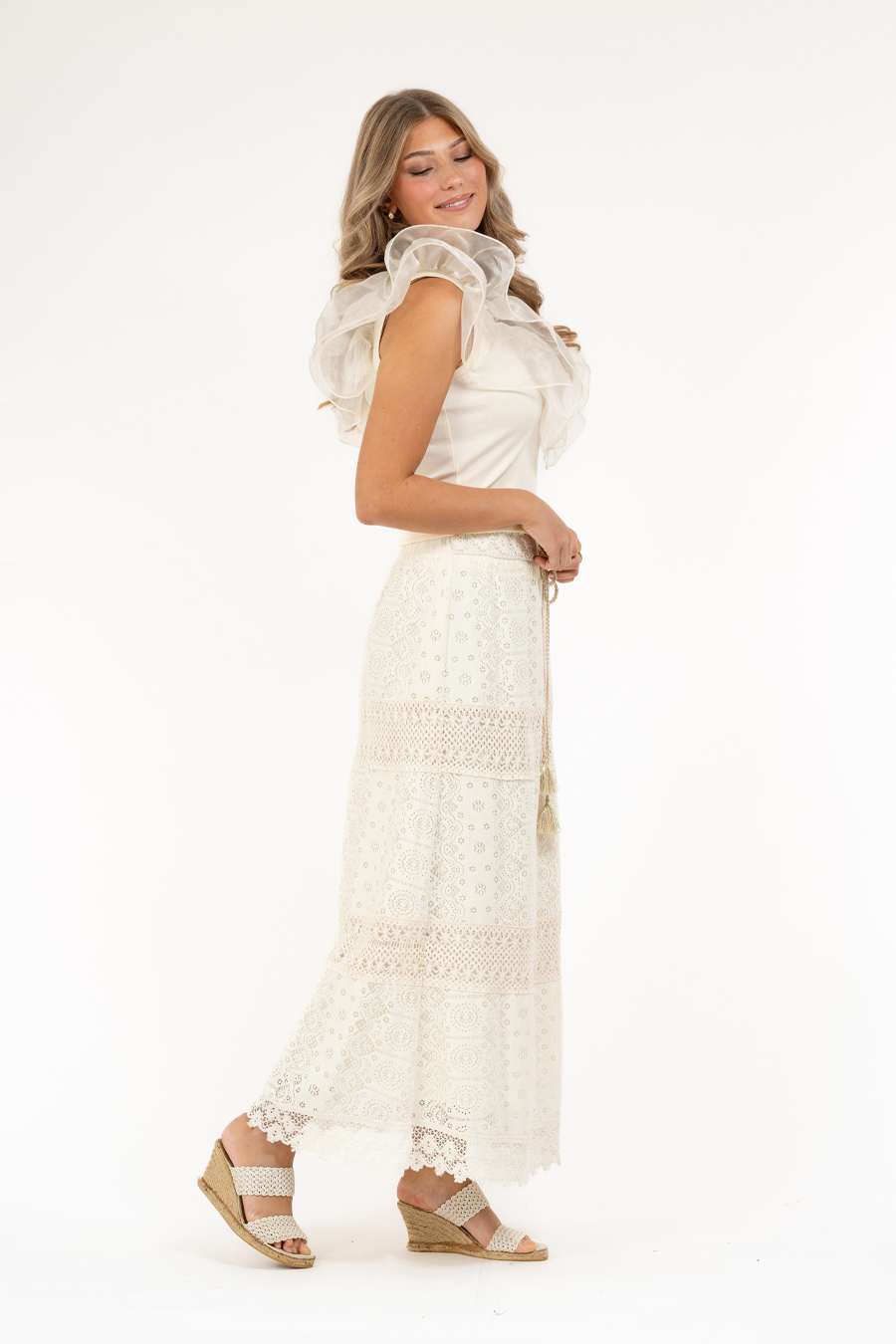 Hihoissa ja pääntiessä näyttävät organza-röyhelöt.