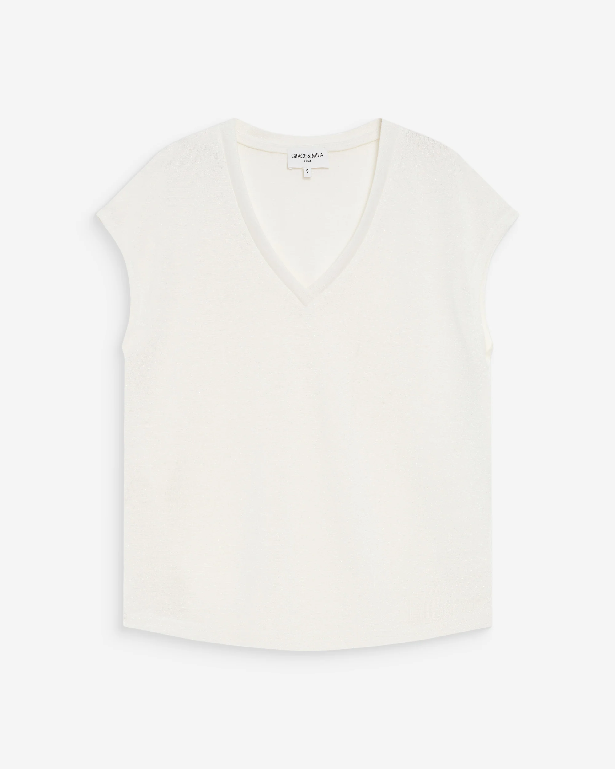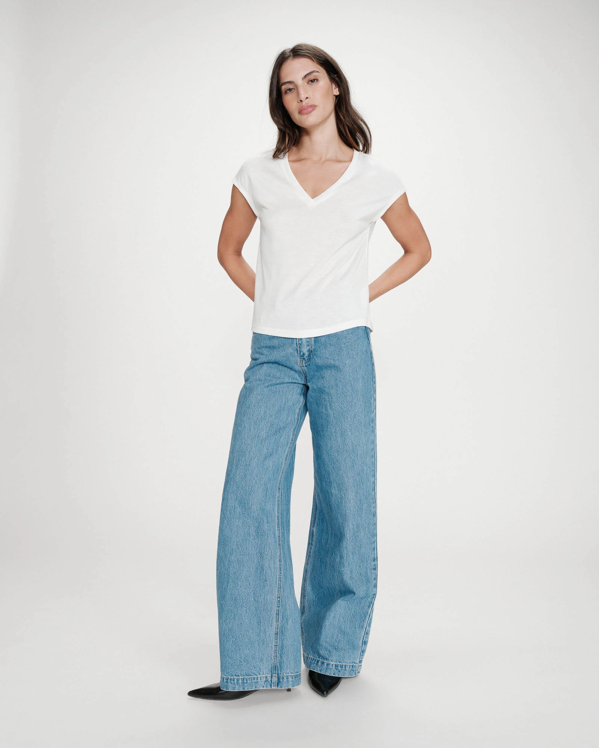 Lyhythihainen t-paita v-pääntiellä.